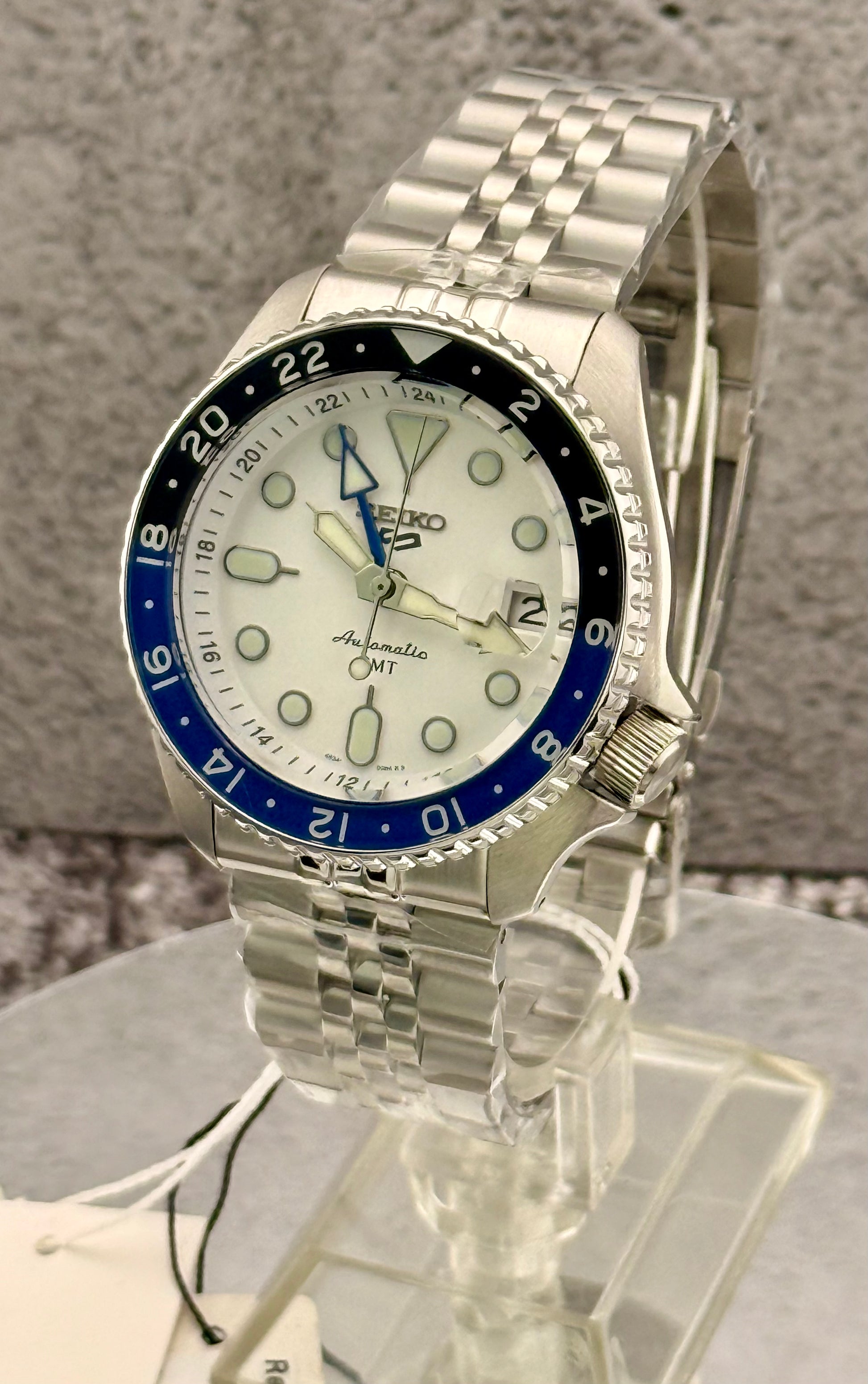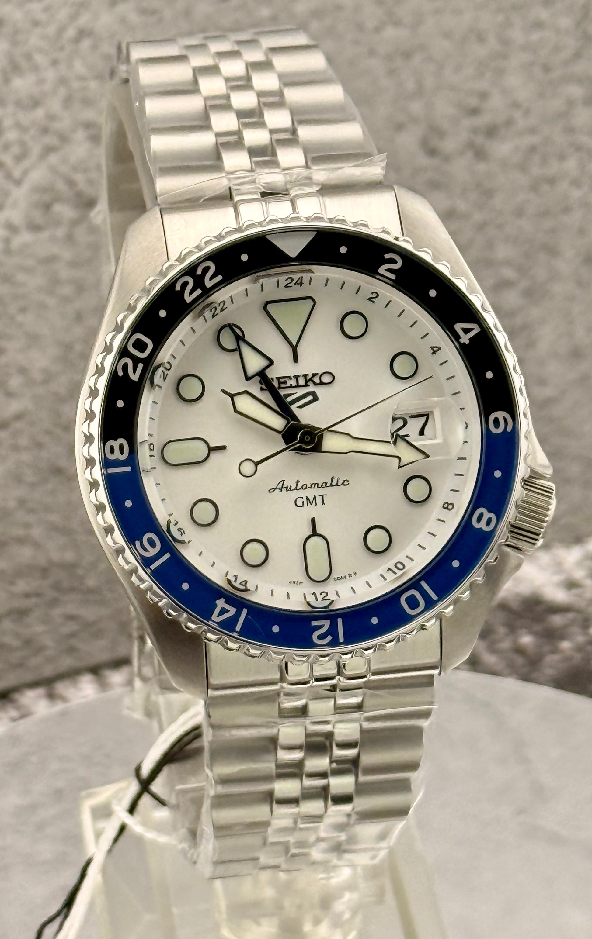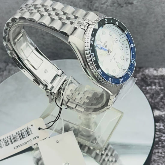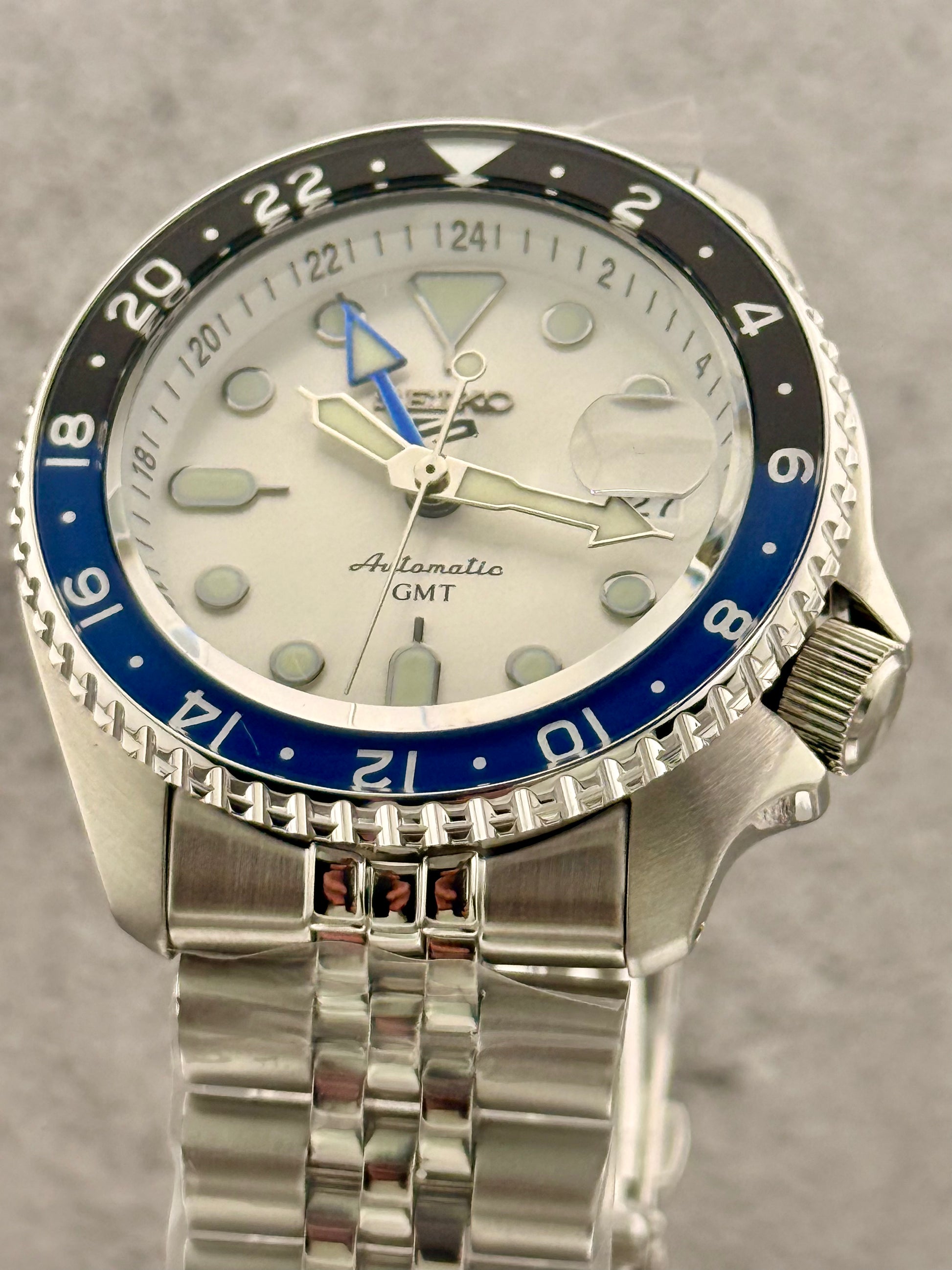Model: Seiko 5 Sports GMT SSK033K1 (“White Cloud” White Dial & Sky‑Blue Bezel)